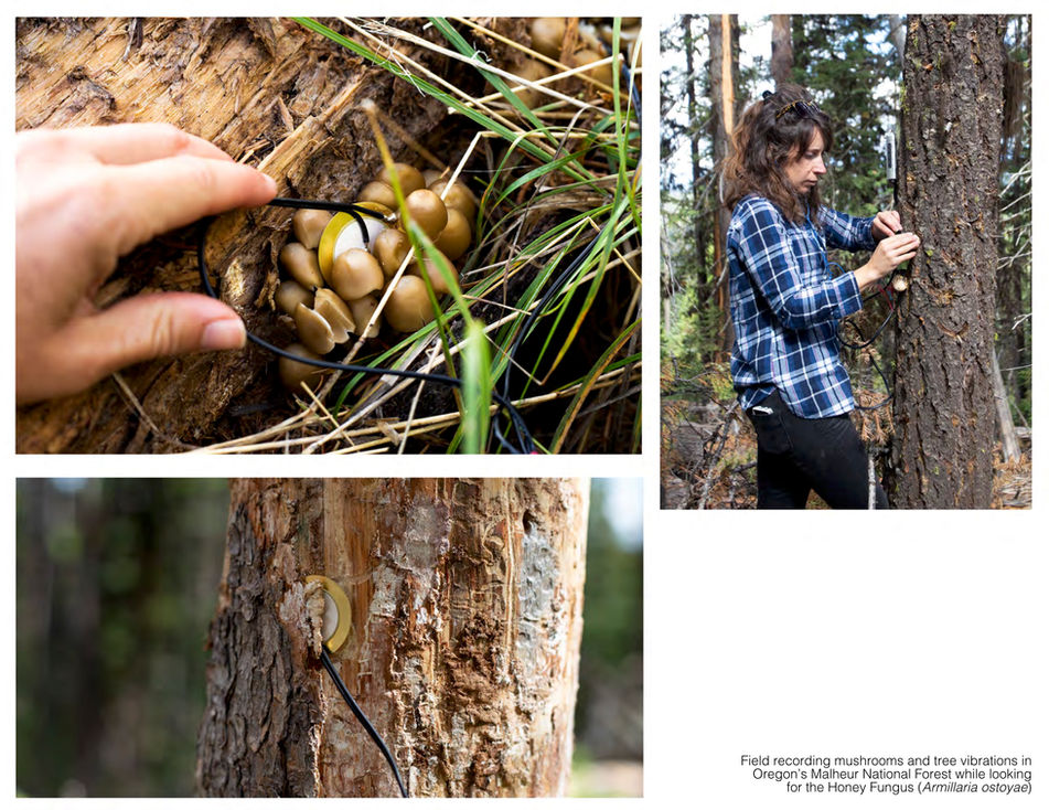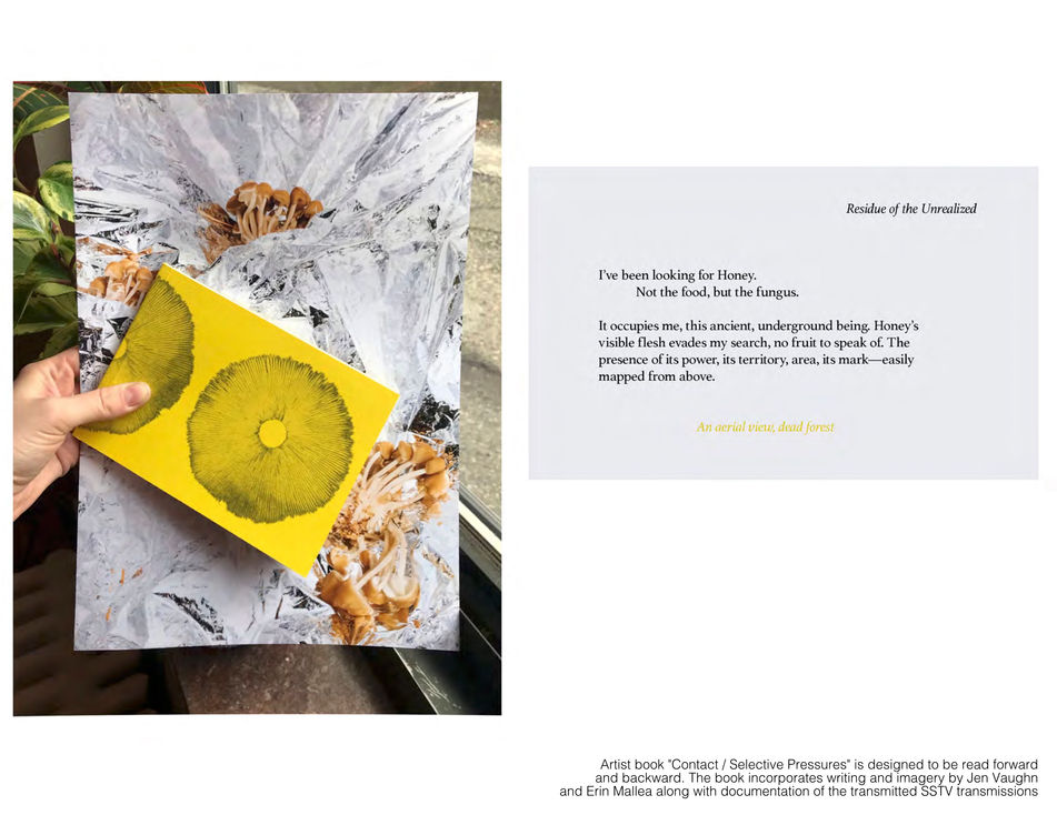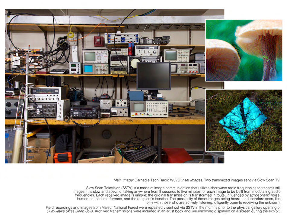 Cumulative Skies, Deep Soils is an ongoing collaborative project between Jen Vaughn and Erin Mallea. The project exists in several forms, beginning as a performative act of attempting to listen to the vibrations of an ancient rhizomatic network of fungus in Oregon. Jen’s act of listening turned touch into sound, while thousands of miles away Erin took these sounds and images and transmitted them throughout the atmosphere via SSTV, a form of outdated image transmission via radio. As an installation, the work incorporates audio, SSTV video, crystallizing spills, writing, and sculptures formed from meteorites, debris, and mycelium. Together, Vaughn and Mallea aim at an expanded intimacy—a move towards contact despite distance, difference, and time. Each action threads together accumulations of decay with moments of the living, the cosmic, the future.